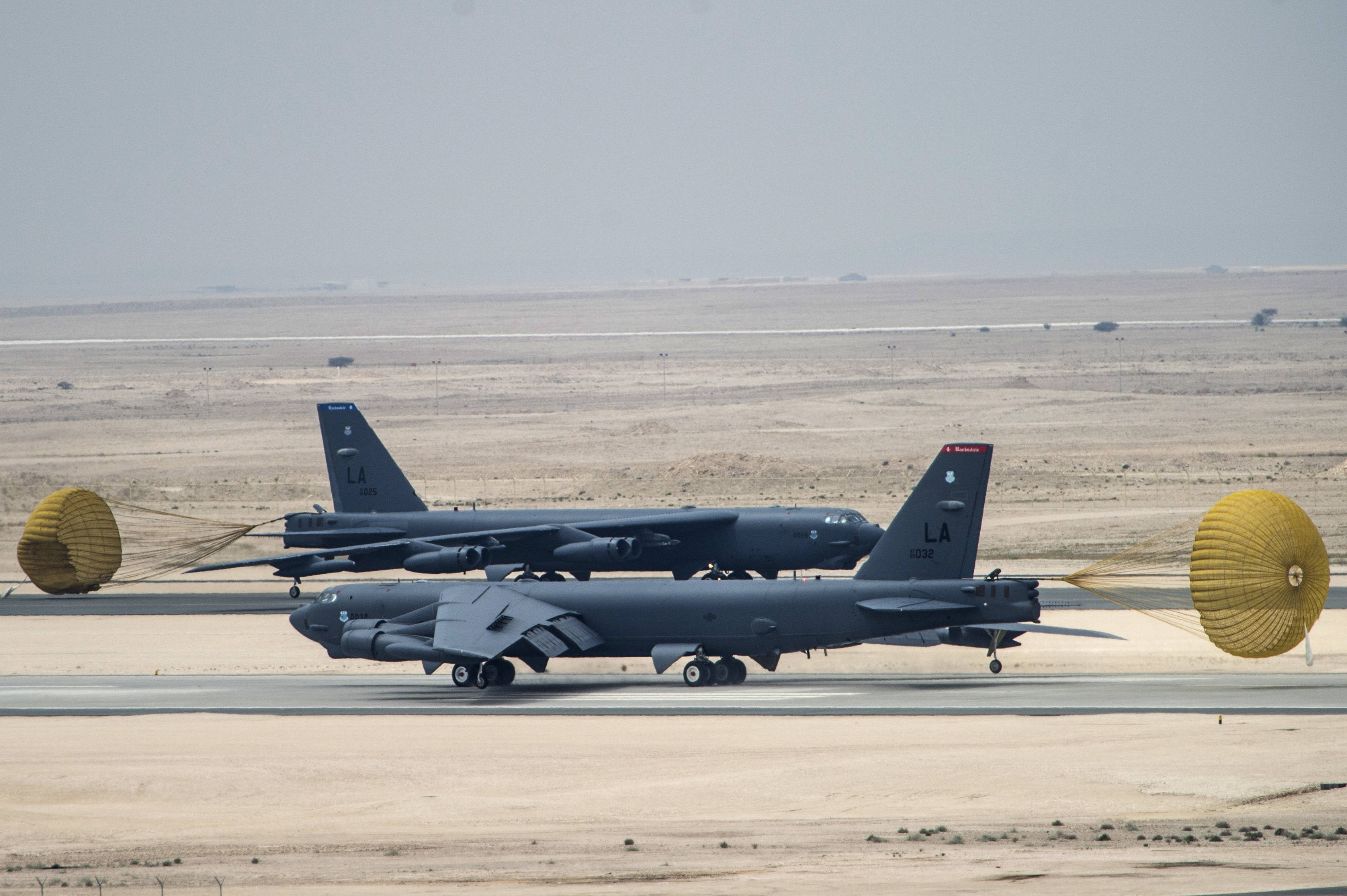 在卡塔尔乌代德空军基地的美国空军B-52轰炸机。新华社/美联近来,美英等国正在临近伊朗的地区撤离人员。